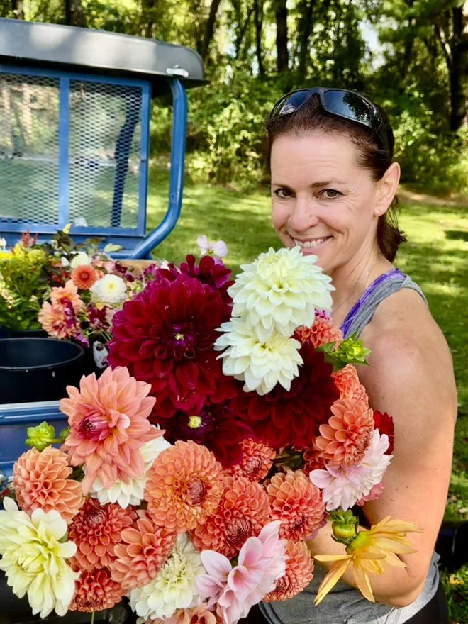 Hi, I’m Kristi. I farm and live in West Friendship with my husband, energetic young son, our crazy puppy, a couple of barn cats, and tens of thousands of honeybees. I love to grow and design with beautiful Maryland grown flowers. Loads of various wildlife, including lots of deer and groundhogs who like to eat flowers live here too, though they weren’t invited. Technically they were here first, so I guess I’m the one who wasn’t invited.
